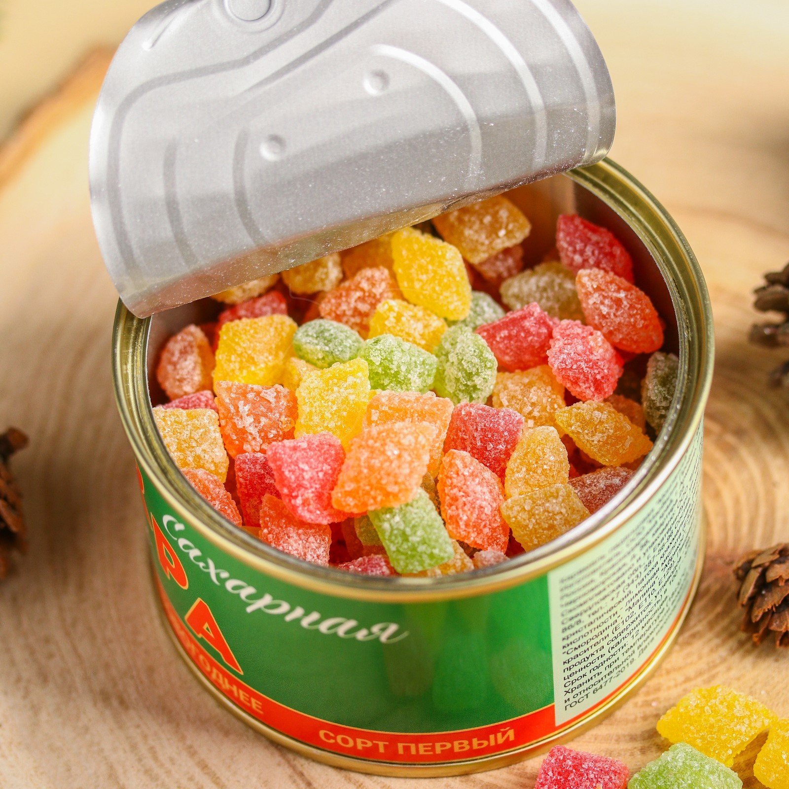 | Состав | сахар белый кристаллический, патока крахмальная, регулятор кислотности - лимонная кислота (Е330), ароматизаторы: "Смородина", "Малина", "Абрикос", "Лимон", "Яблоко", красители (Е102, Е110, Е129) |